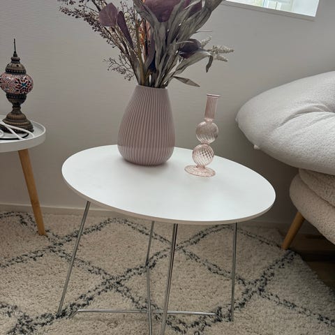 Har en hvid overflade der er nem at rengøre og bordben af børstet stål.