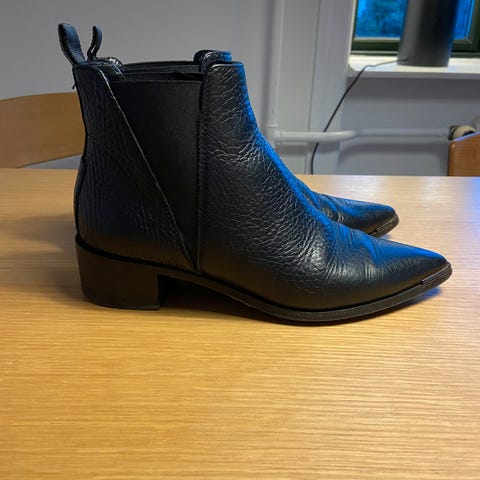 Acne Studios støvler i størrelse 37. Fremstillet i sort læder med lynlås på siden. Støvlerne har en hæl og er designet til almindelig brug.