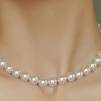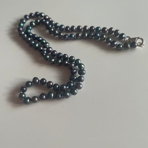 Halskæde lavet af grå 10 mm ferskvandsperler med en længde på 44 cm plus en forlængelse på 5,5 cm. Kan anvendes som smykke til mange lejligheder.