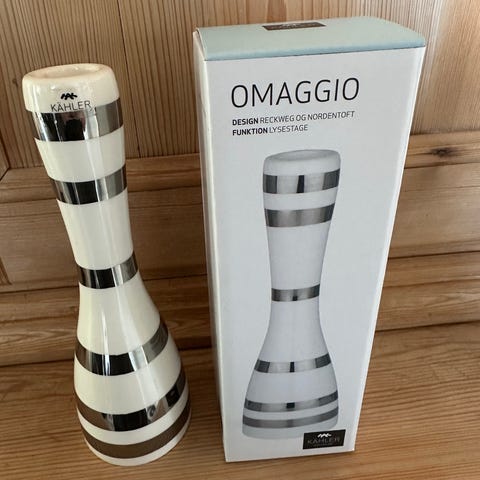 Lysestagen er fejlfri. Hvid med sorte striber. 16 cm høj. Passer til kronelys. Sender gerne
