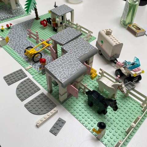 LEGO Rideskole og stald med alt, hvad der hører til på en rideskole. Tre heste, bil med hestetrailer, sulky, tre figurer, spring m. bomme til ridebanespringning. Desuden alle mulige småting til pleje og pasning af hestene.