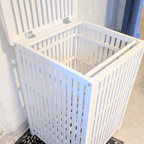 Vasketøjskurv - i hvidmalet træ. Trænger tilat blive malet over. Med aftageligt låg og pose indeni. Mål: 35 x 35 x 56.
