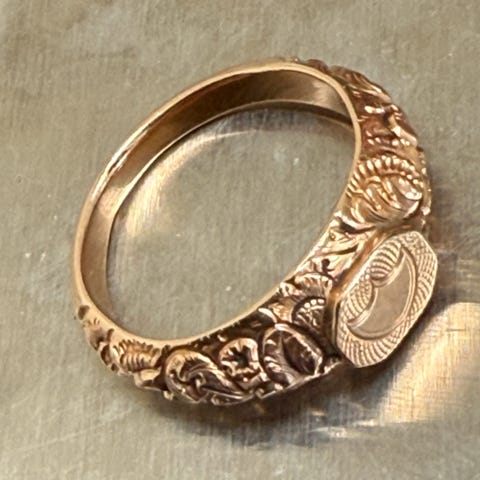 Ring af 14k guld prydet med karneol, ringstr. ca. 61, vægt ca. 7,6g