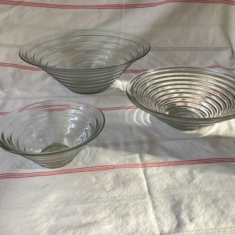 Ananasformede skåle i glas med prægning og form så de ligner ananas. Den store er ca 24x19x8 cm og de små er ca 15x12x5 cm.