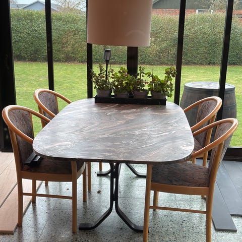 Jeg sælger et spisebord med tilhørende stole. Både bordet og stolene har enkelte små ridser, hvilket kan ses på billederne. Spisebordet og stolene er for 500kr.
