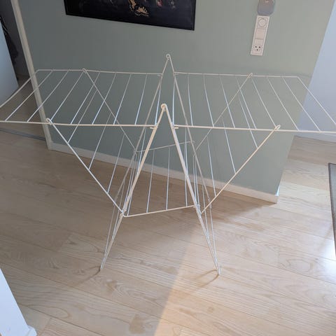 Tørrestativ lavet i metal med foldbar funktion. Designet til at blive brugt indendørs til tørring af tøj. Har gummibelagte fødder for stabilitet og beskyttelse af gulve.