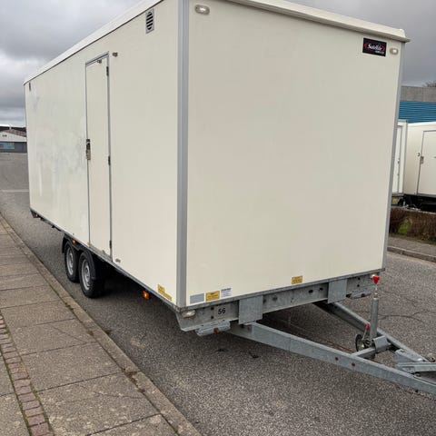 Mandskabsvogn med opbevaring, toilet og bad og køkken/spiseplads til 4.
