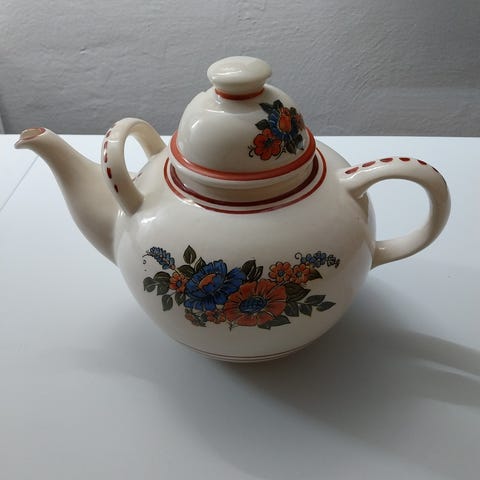 Kanden indeholder 0,75 liter og krusene er 10 cm. høje.