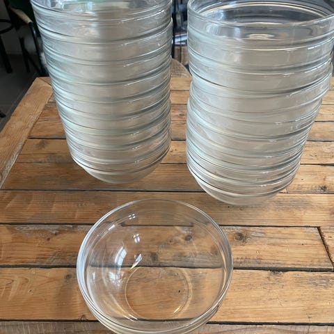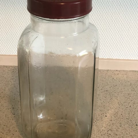 Glaskrukke med hvidt glaslåg fra Luminarc. Ca 21 cm høj og ca 10 cm i diameter. Har stadig lidt af Luminarc klistermærket tilbage. Har lidt mærket på låget - se billede.