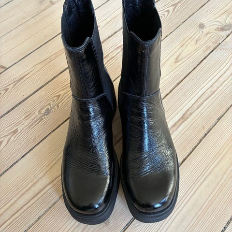 Vagabond støvler i størrelse 39, sort farve. Fremstillet i læder med lynlås på indersiden og justerbar spænde ved skaftet. Støvlerne har en lav hæl og en slidstærk sål, velegnet til dagligt brug. Meget lidt brugt.