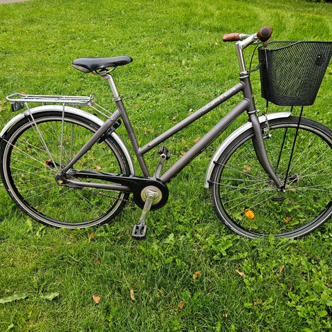 Woom Bycykel til mænd i sølvfarve. Cyklen har en klassisk ramme med lige styr, bagagebærer og skærme. Den er designet til bykørsel og har pedaler og komfortabelt sæde til daglig brug. Skal have luft i dækkene, helt ubrugt cykelpumpe medfølger. Og så skal kablerne udskiftes, har 7 indvendige gear.