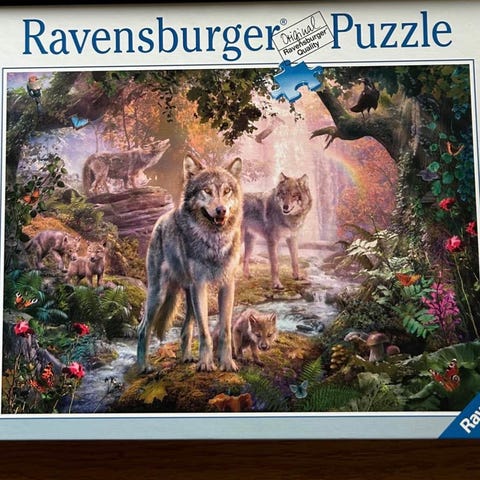 Ravensburger Puzzle med motiv af forskellige dyr. Indeholder et billede med elefanter, løver og andre dyr i en naturkulisse. Egnet til puslespilsentusiaster og dyreelskere.