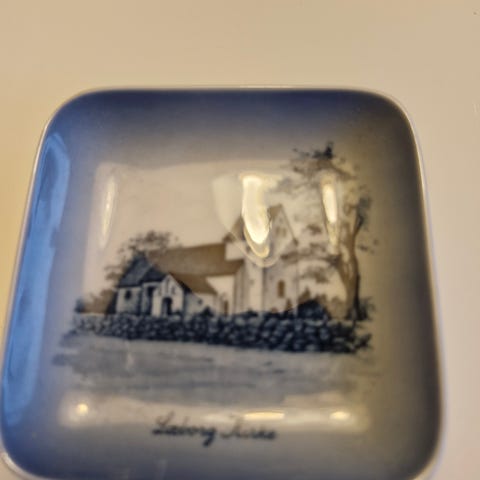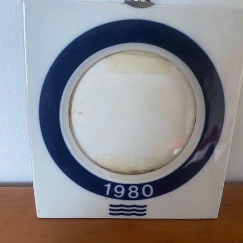 Royal Copenhagen Fajance 1971 fotoramme med blå dekorative mønstre. Fremstillet i fajance materiale. Fotorammen har en firkantet form med plads til et rundt billede. Ingen afslag, ingen skår.