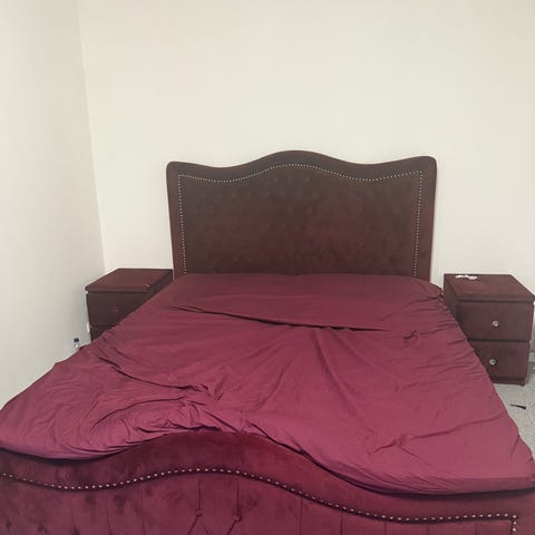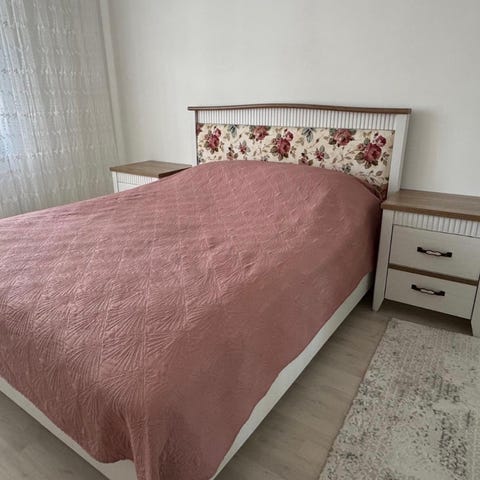 Flot sølv seng (UK King størrelse - 160cm vide) med madras, 2 matchende sengeborde og sminkebord.