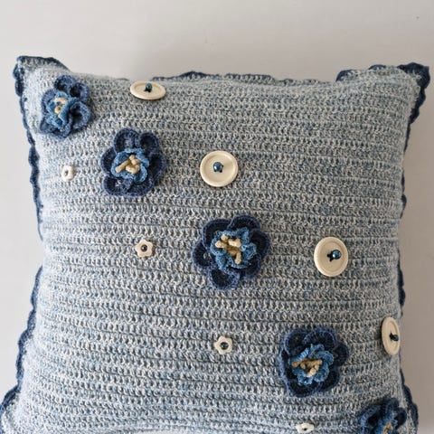 Hjemmelavede hæklede puder i brun, flaskegrøn og rosa. Den brune er kvadratisk 39*39 cm. Der er rosa fleece eller grå fleece på bagsiden og lynlås.