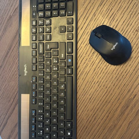 Cooler Master tastatur med sort farve og USB-forbindelse. Logitech G mus med USB-forbindelse og sort farve. Musen har også en vægt man kan tage ind og ud for at gøre musen lettere eller tungere. Begge enheder er kablede og beregnet til brug med computer.