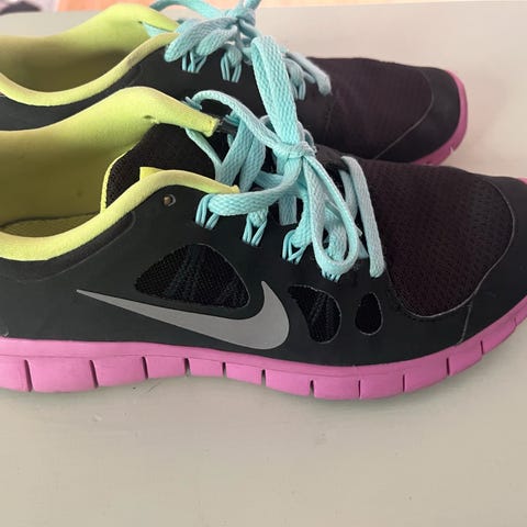 Nike løbesko i størrelse 42 med sort farve. Skoene har et netdesign og en hvid sål. Egnet til sport og løb.