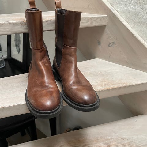 ECCO støvler i størrelse 42. Støvlerne har snørelukning og kraftig sål med mønster for bedre greb. Farven er grå med sorte snørebånd. Materialet er læder, hvilket giver slidstyrke og komfort.