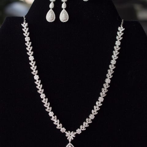Smykkesæt af sterlingsølv med 14 karat hvidguldsbelægning og cabochonslebne sten af sort opal og facetslebne klare zirkoner(hvidguldsbelægningen beskytter smykket mod oxydering).