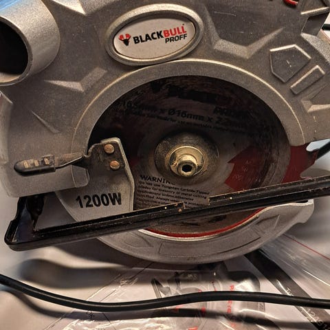 (Uden oplader) rundsav med laser til præcise snit. Udstyret med håndtag og batteridrevet motor, egnet til forskellige savopgaver.
