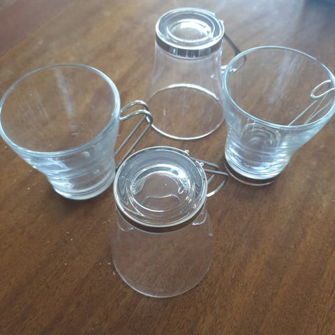 4 stk. glas krus med teksten Irish cafeer, med hank, str. i alt ,H. 14½ x 7 cm. i diameter, kan hentes alle 4 stk. for 50 kr.