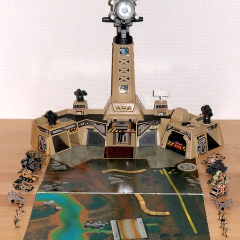 1 tank på larvefødder (og små hjul) - med kanonrør, 1 åbent militært køretøj med hjul foran, larvefødder bagtil og maskingevær på ladet, 1 luftpudebåd med missilbatteri og 1 jagerfly samt 4 små soldater med riffel, maskinpistol, maskingevær og bazooka.
