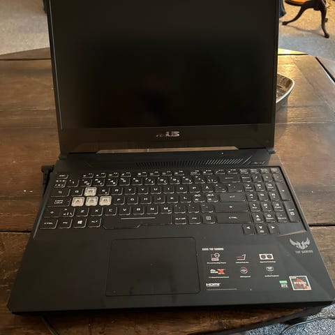 Asus gaming laptop i sort farve med baggrundsbelyst tastatur. Bærbar computer designet til gaming med robust ydre og avancerede funktioner.