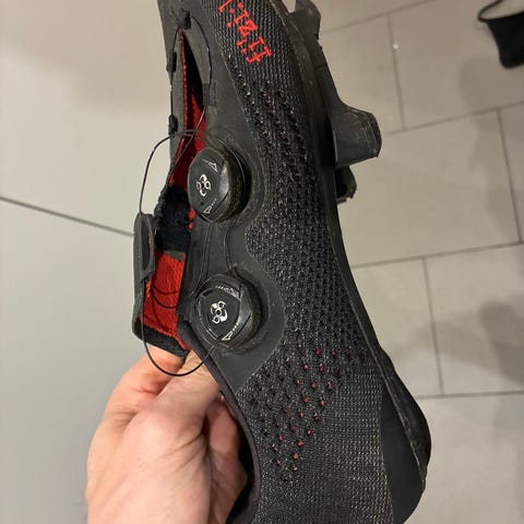Fizik Terra cykelsko i størrelse 45. Skoene har en kombination af grå og sorte farver med velcrolukning og robuste såler. Designet til at give støtte og komfort under cykling.