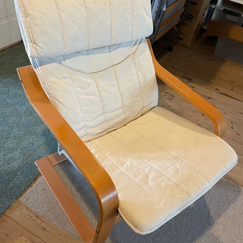 Lænestol med formstøbt stel i bøgetræ og sort & hvidt stof. I rigtig pæn stand.