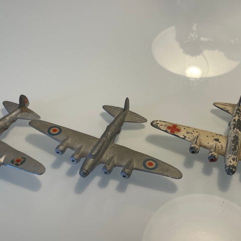Metal legetøjsfly med to motorer og en grå, slidt finish. Flyet har en bred vingeudstrækning og detaljer, der viser brugsspor. Egnet som samlerobjekt eller legetøj.