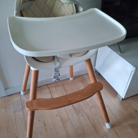 Højstol til børn i grå farve. Højstolen har en aftagelig bakke og sikkerhedsseler. Den er designet til at give støtte og komfort under måltider.