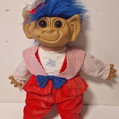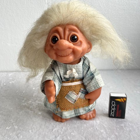 Troll dukke med langt hvidt hår og tøj i blå og hvide farver. Dukken har en karakteristisk ansigtsudtryk med store øjne og er lavet i plastik med tekstilbeklædning.