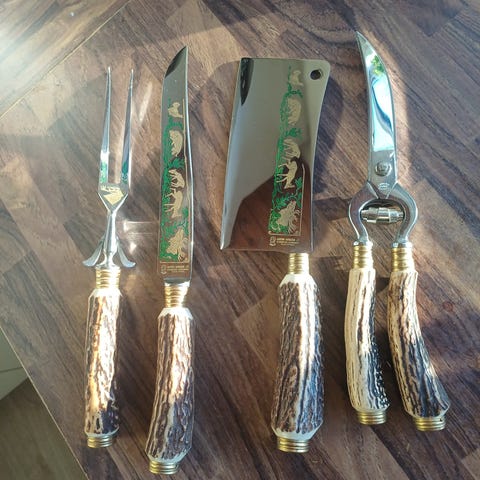 PEJSESÆT I MASSIVT MESSING MED JAGT MOTIV.