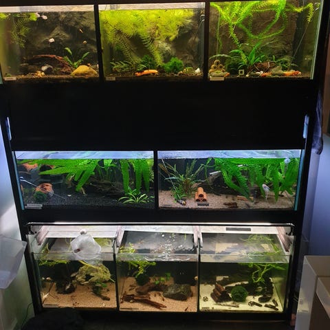 Sælges uden indhold og kun med lys, filter, luftpumpe til at køre det hele og reol, dog mangler der lys til 20L og 10L