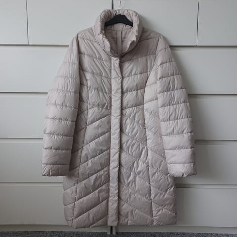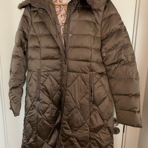 Kort frakke i camelfarvet uld med sød rynkedetalje i halslukningen. Nærmest ubrugt - fejlkøb pga. forkert størrelse. Der står ingen størrelse i frakken, men den svarer til en str. 40-42.