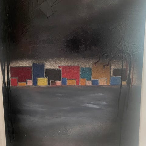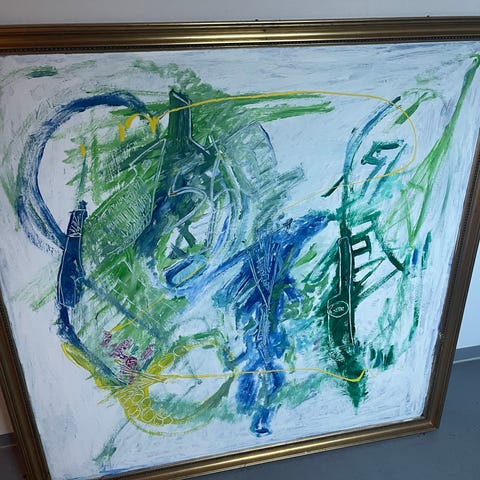 Abstrakt maleri med svæveramme, kunstner har signeret og er signeret i hjørnet. Maleriets mål med ramme er 104*104 cm.