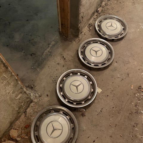 hjulkapsler i sølvmetal til Mercedes W123