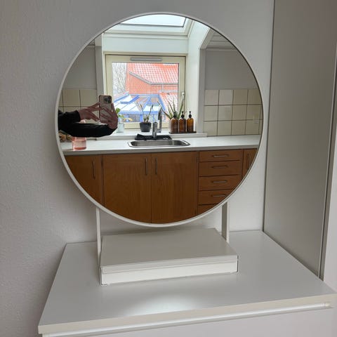 IKEA rundt spejl med hvid ramme. Spejlet har en enkel og moderne design, velegnet til vægophæng i forskellige rum.