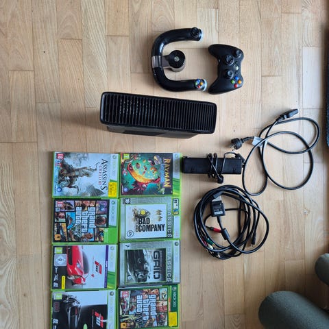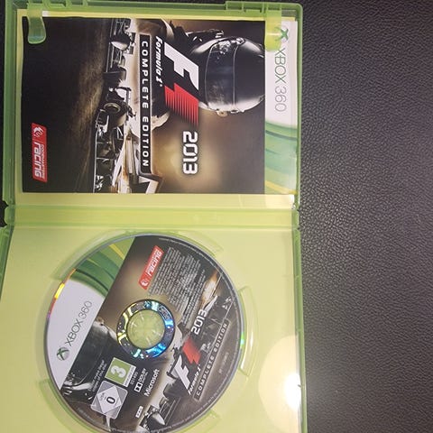 Få et helt Formel 1 setup med rat, 3 Formel 1 spil (2010,2013 & 2014) og en controller og så en Xbox 360 s konsol.