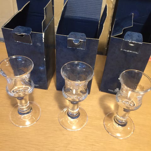 "Royal Yacht" snapseglas fra Holmegaard 8,9 cm H. Designet af Per Lütken i 1978 som et party set til Skibsglassene. Kraftigt udformet glasservice