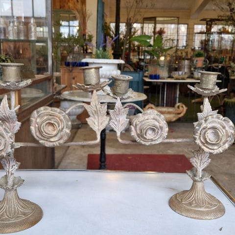 Par majestætiske antikke franske kirkestager med porcelænsblomster