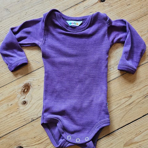 Joha uld body i størrelse 62 til pige. Bodyen er lilla med striber og lavet af uldmateriale.