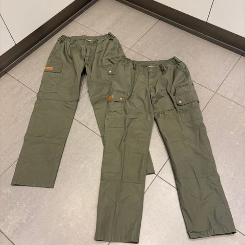 Bukserne koster I de forskellige jagt og friluftsbutikker, 599 kr pr par. Jeg sælger alle 4 par samlet for kun 1.100 kr