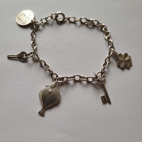 Armbånd med 5 vedhæng. (firkløver, nøgle, rødspætte, nøgle samt danmarkskort). Sølv ? Retro.