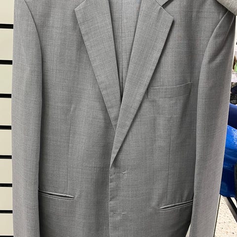 Pænt gråt jakkesæt med enkelt lysere strib. Brugt en enkelt gang.