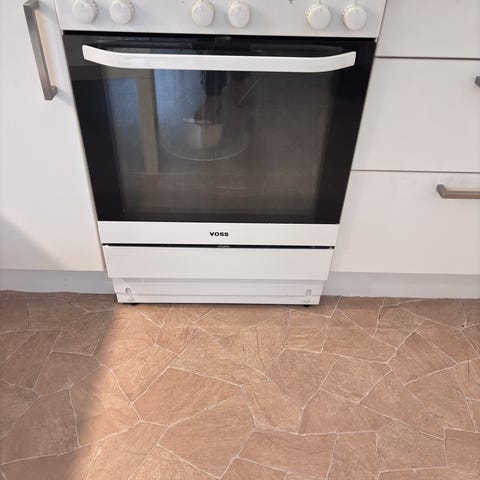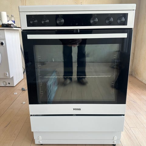 Pænt Voss komfur med varmluft og 4 keramiske kogeplader og stikkontakt.