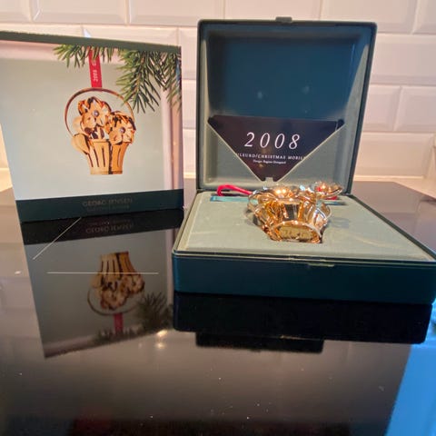 Juleuroen er udført i messing belagt med 24 karat guld. Originalt rødt og grønt silkebånd og æske.