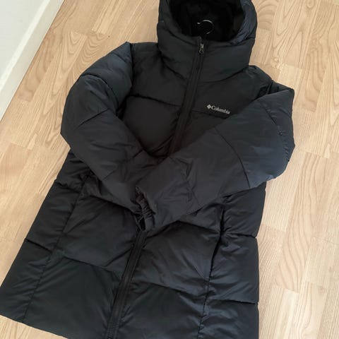 Columbia Vinterjakke i sort farve, (Puffer) størrelse S, fremstillet med dun som isoleringsmateriale. Designet til kvinder og egnet til kolde vejrforhold. Meget fin stand. Fine detaljer som guldfor og fx både mat og skinnende overflade