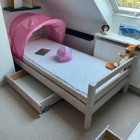 90x185 cm seng med praktiske opbevaringsskuffer.