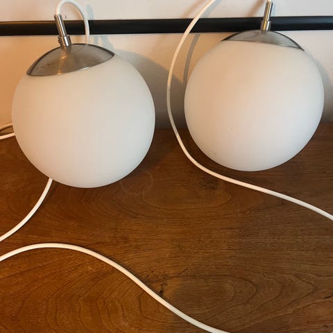4 stk pendellamper måler 33 cm i dia. Hvidt glas med chrom ophæng. Alle 4 900 kr, pr stk 300 kr. afhentes i Søborg sender ikke